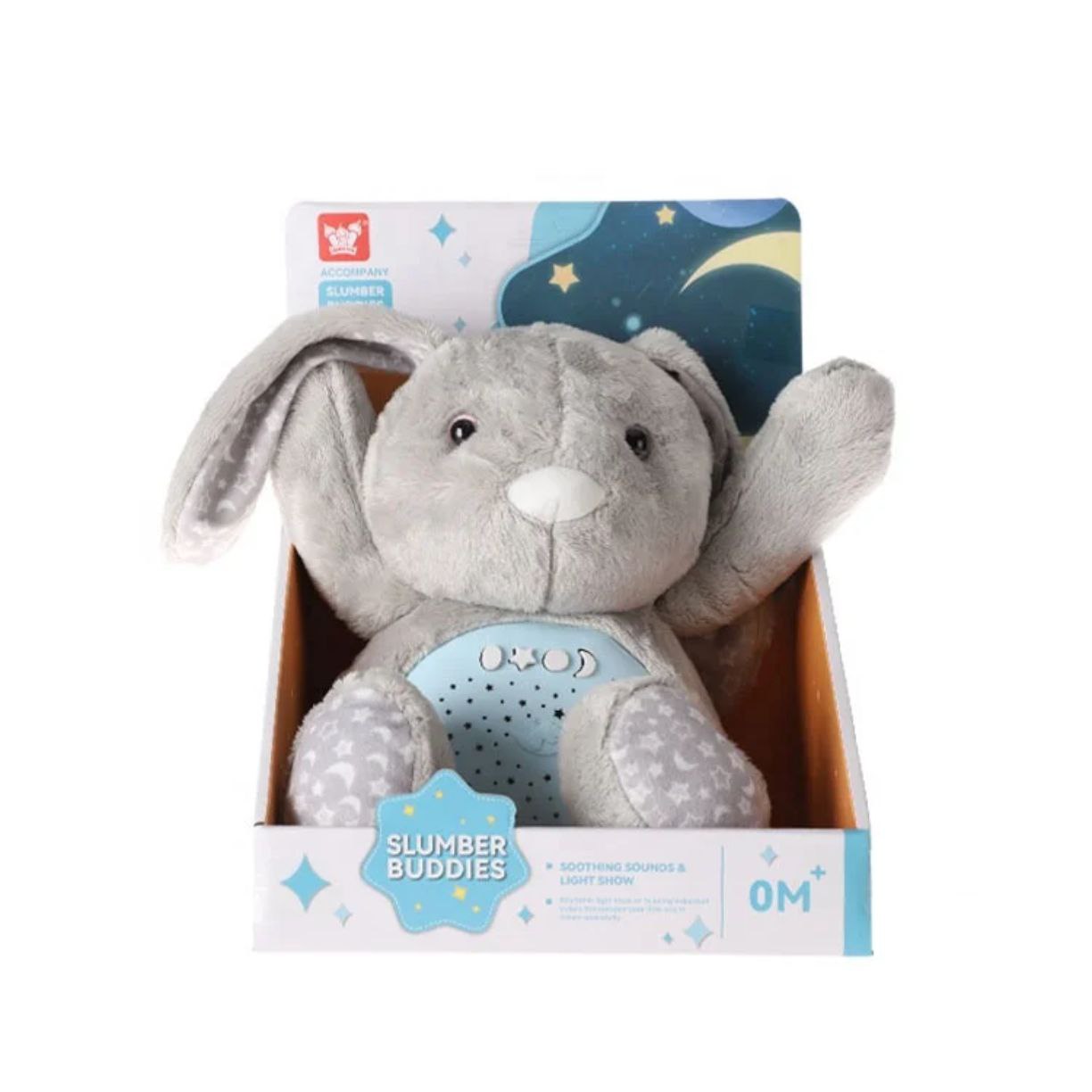 هي لعبة قطيفة ناعمة (على شكل أرنب أو دب) مصممة لمساعدة الطفل على النوم (0M+). الميزات الأساسية: أصوات مهدئة (Soothing Sounds): تشغيل موسيقى هادئة. عرض ضوئي (Light Show/Projector): إسقاط صور نجوم وأشكال القمر على السقف من خلال فتحات في بطن الدمية. الأزرار: تحتوي على أزرار تحكم مخفية على شكل أشكال هندسية للقوة/التشغيل والموسيقى والضوء.