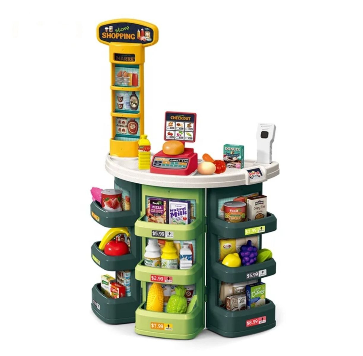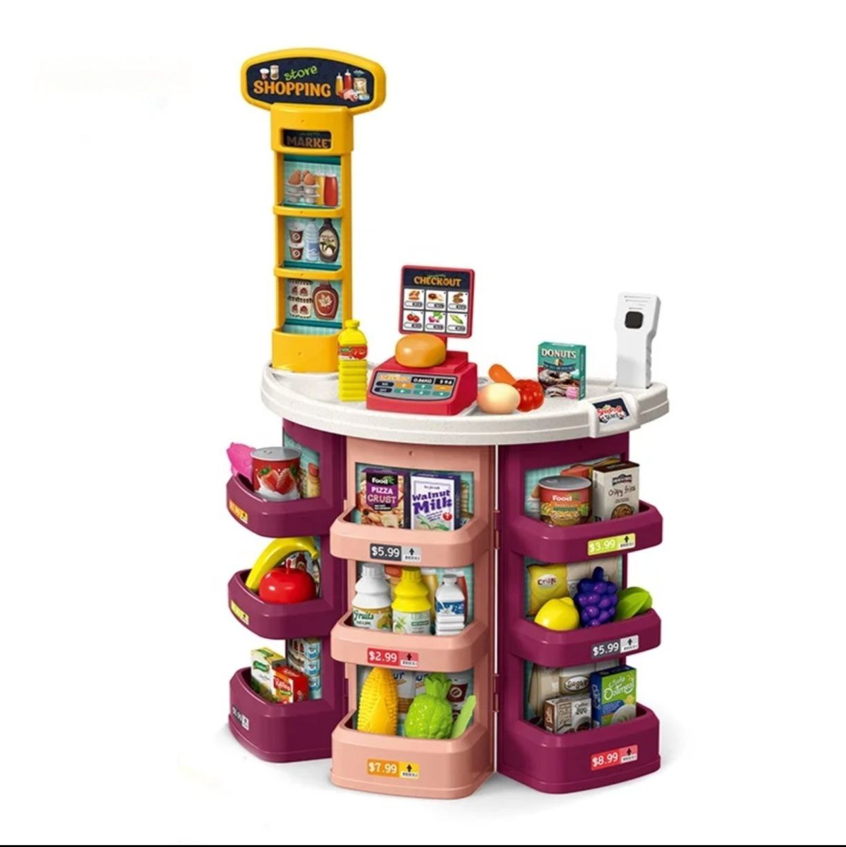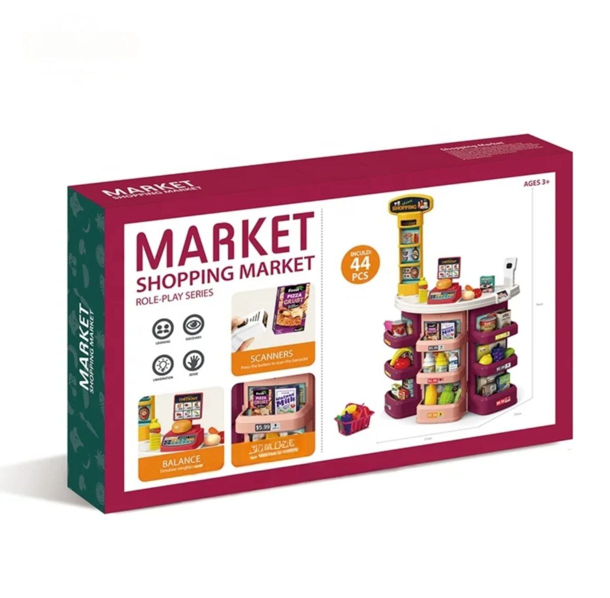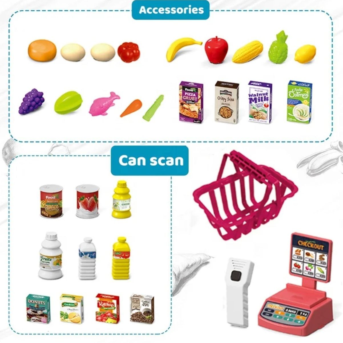 تحتوي على 44 قطعة متنوعة من الخضروات والفواكه والعلب والمنتجات الغذائية. مزودة بـ ماكينة كاشير إلكترونية مع ماسح ضوئي (سكانر) وصوت يشبه الحقيقي. تتضمن سلة تسوق صغيرة ليتمكن الطفل من جمع مشترياته. أرفف تخزين منظمة لعرض المنتجات مثل العلب، الزجاجات، العصائر، والوجبات. تساعد على تنمية الخيال، وتعزيز مهارات التواصل، والتعرف على أسماء الأطعمة. مصنوعة من مواد آمنة وعالية الجودة للأطفال.