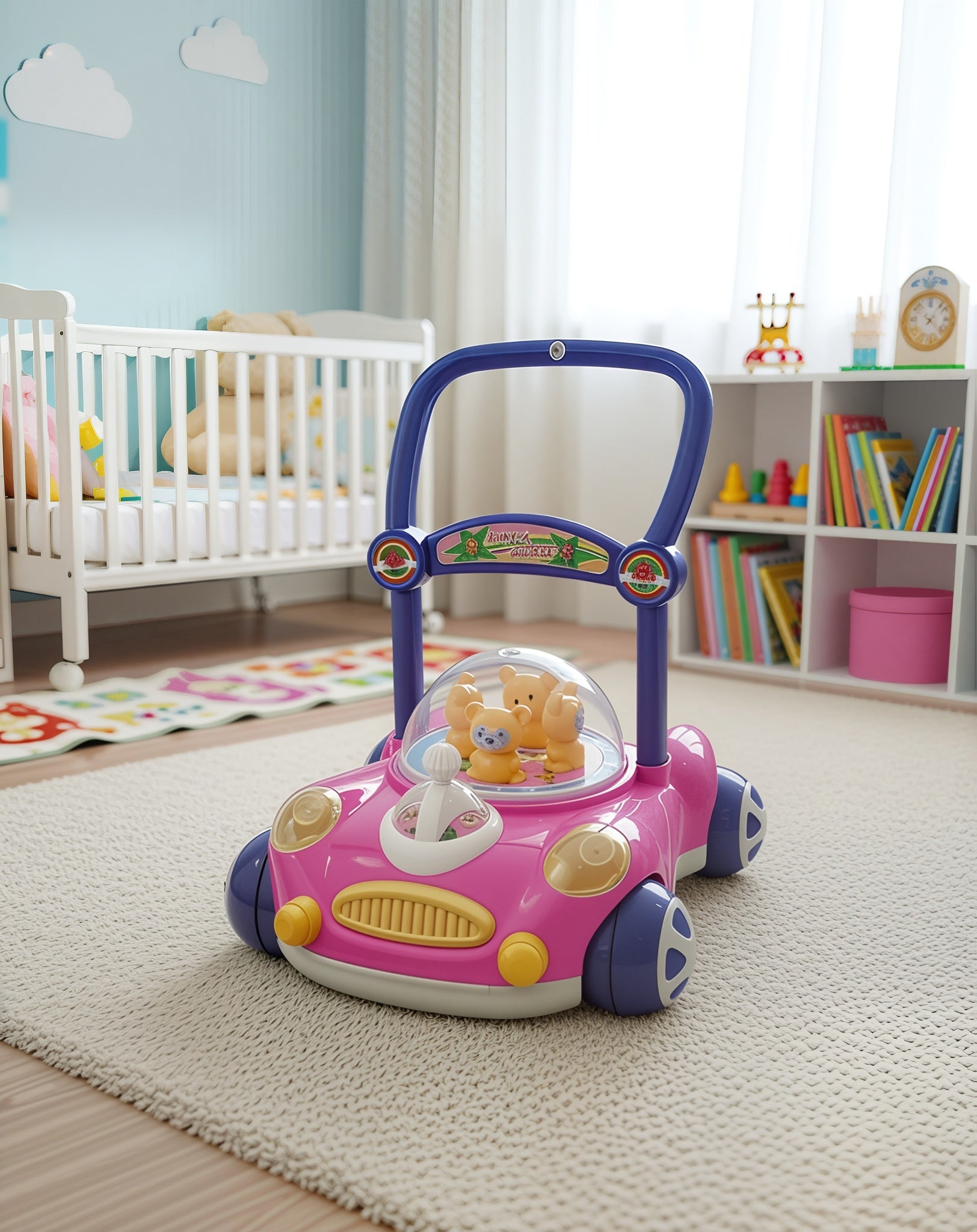 وكر للأطفال الوصف: ساعدي طفلك على أولى خطواته مع المرح والتعلم مع مشاية الأطفال الموسيقية التفاعلية! هذه المشاية ليست مجرد وسيلة للمشي، بل لعبة متكاملة: تضيء بألوان جذابة وتغني أغاني مرحة، وكلما خطا الطفل خطوة، تدور الألعاب المعلقة على اللوحة الأمامية لتشد انتباهه وتشجعه على الحركة والمشي بثقة. تصميمها التفاعلي يجعل كل خطوة تجربة ممتعة ومسلية، مع تنمية حواس الطفل وتعزيز حبه للاستكشاف والموسيقى. المميزات: إضاءة جذابة ومبهجة: تضفي جوًا ممتعًا وتشجع الطفل على اللعب. أغاني مدمجة: تغني أثناء حركة الطفل لزيادة المرح وتحفيز المشي. ألعاب دوارة على اللوحة الأمامية: تتفاعل مع خطوات الطفل لتشد انتباهه وتشجعه على الحركة. تصميم تفاعلي ممتع: يدمج اللعب والموسيقى والتنمية الحركية في تجربة واحدة. تنمية المهارات: تحفز الحركة، وتطور التنسيق بين اليد والعين، وتعزز الفضول والاستكشاف