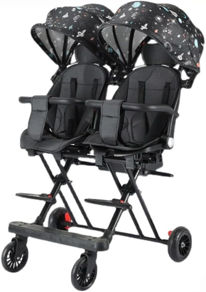 أبعاد عربة الأطفال المزدوجة غير المطوية: الطول 50 سم (19.7 انش)، العرض 55 سم (21.6 انش)، الارتفاع 89-92 سم (35-36.2 انش)